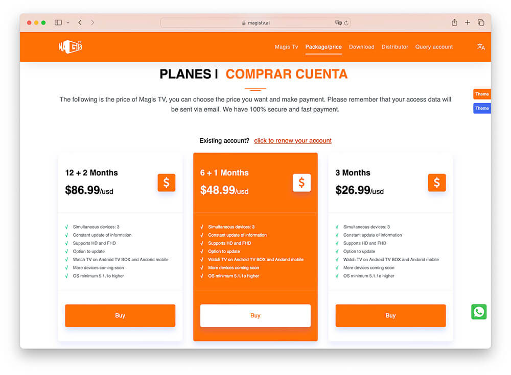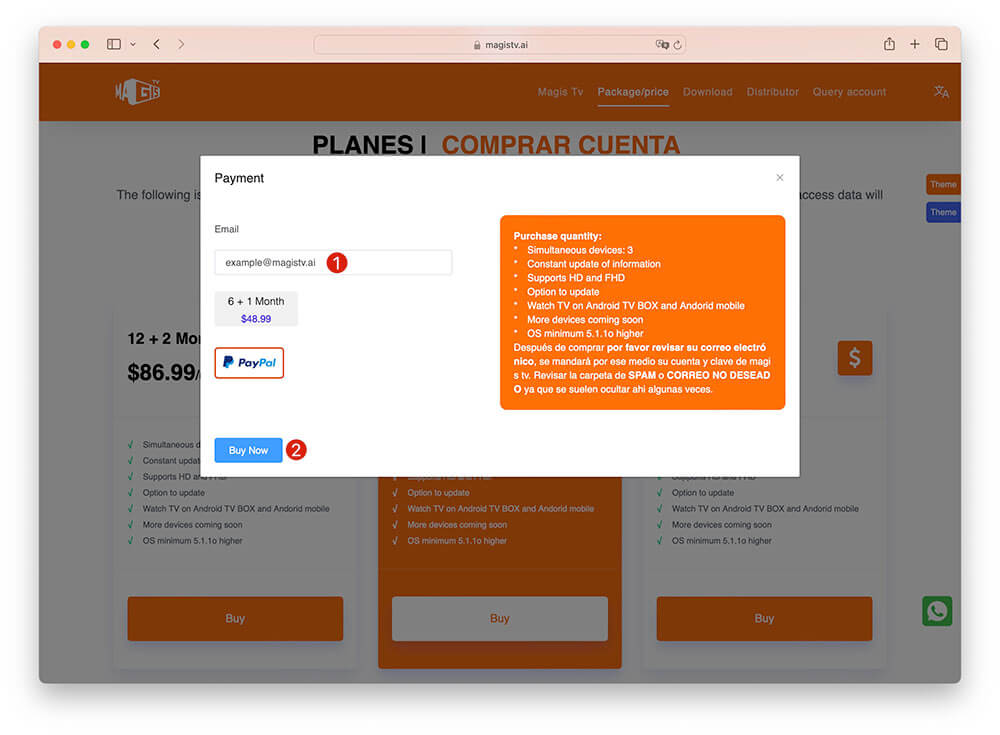 1.Browse and select the subscription package (PLANES) you wish to purchase, then click 'Compra'.